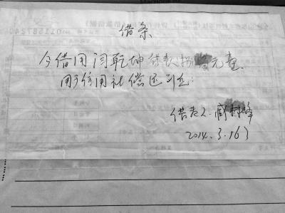 臧林峰給閆乾坤寫的“借條”顯示:“今借用閆乾坤貸款捌萬元整,用于信用社償還利息”,落款日期為2014年3月26日。