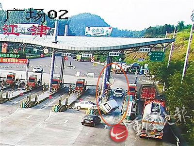 8月25日凌晨,民警接到線索,嫌疑車輛再次出現(xiàn)。民警馬上在渝瀘高速江津沿線進(jìn)行蹲守。早上7時(shí)42分許,嫌疑車輛緩緩駛?cè)胗鍨o高速G93江津收費(fèi)站,埋伏在收費(fèi)亭內(nèi)的民警,試圖在嫌疑人停車?yán)U費(fèi)時(shí)將其控制。不料對(duì)方見勢不妙,啟動(dòng)車輛準(zhǔn)備沖卡逃跑。這時(shí),另一隊(duì)蹲守在收費(fèi)站外的民警立即將警車開到前方,把嫌疑車輛堵在收費(fèi)車道內(nèi)。嫌疑人駕車對(duì)警車進(jìn)行多次強(qiáng)烈撞擊,企圖撞開警車后逃竄,但均未得逞。隨后,嫌疑人又猛烈倒車,企圖撞開后方社會(huì)車輛。
