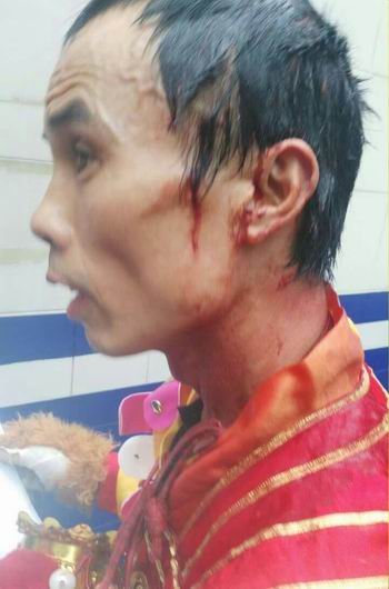 當(dāng)日下午,“猴王”打架一事就是因?yàn)闋幍乇P而起。其中一名老“猴王”被一名年輕“猴王”用金箍棒打傷了左側(cè)頭部,鮮血直流。最后,經(jīng)過警方的協(xié)調(diào),雙方達(dá)成一致。打人者賠償被打者1500元醫(yī)藥費(fèi)。(圖片由警方提供)
