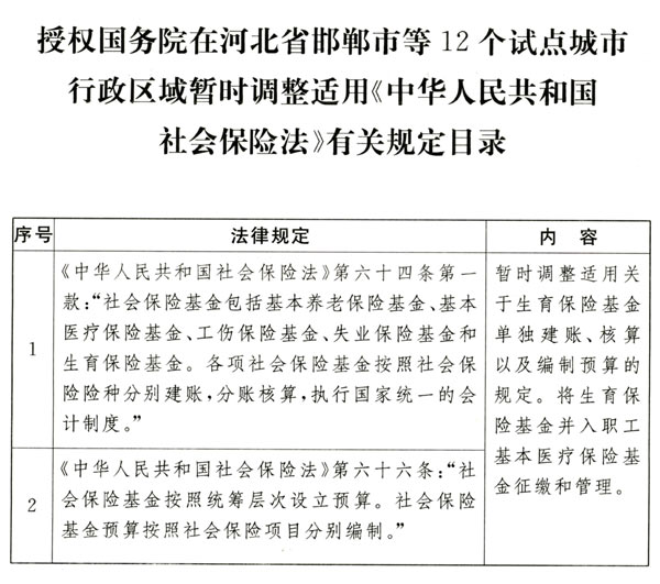 為進一步增強生育保險保障功能,提高社會保險基金共濟能力,推進生育保險和基本醫(yī)療保險合并實施改革,第十二屆全國人民代表大會常務委員會第二十五次會議決定:授權國務院在河北省邯鄲市、山西省晉中市、遼寧省沈陽市、江蘇省泰州市、安徽省合肥市、山東省威海市、河南省鄭州市、湖南省岳陽市、廣東省珠海市、重慶市、四川省內(nèi)江市、云南省昆明市行政區(qū)域暫時調(diào)整適用《中華人民共和國社會保險法》第六十四條、第六十六條關于生育保險基金單獨建賬、核算以及編制預算的規(guī)定(目錄附后),將生育保險基金并入職工基本醫(yī)療保險基金征繳和管理。試點方案由國務院作出安排,并報全國人民代表大會常務委員會備案。本決定實施期限為二年。