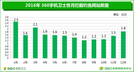 釣魚(yú)網(wǎng)站的活躍期也存在差異。360專家表示,綜合2016年各月的釣魚(yú)網(wǎng)站攔截量情況,可以看出全年的釣魚(yú)網(wǎng)站活躍程度呈現(xiàn)中間低、兩頭高的特點(diǎn)。1月份釣魚(yú)網(wǎng)站攔截量最高,達(dá)到2.5億,8月最低(1.2億次)。