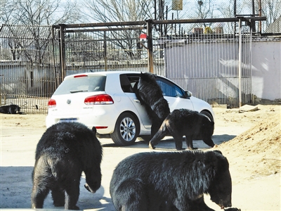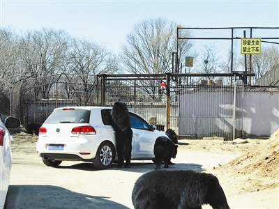 北青報(bào)記者從網(wǎng)友上傳的照片中看到,一輛白色自駕車在黑熊區(qū)域???,車窗打開,有兩只黑熊靠近自駕車,趴在車窗外。