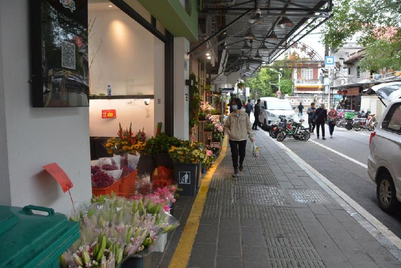 圖為2月8日記者拍攝的廈門溪岸路花鳥市場,黃色實線內側為允許商家“適當經營外擺”的區(qū)域。新華社記者顏之宏 攝
