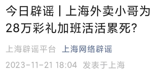 11月20日,上海網(wǎng)絡(luò)辟謠微信官方賬號發(fā)布辟謠文章。針對近日網(wǎng)傳“為掙28萬彩禮娶媳婦,上海外賣小哥活活累死”一事,經(jīng)過核查發(fā)現(xiàn),事件純屬自媒體捏造散布。