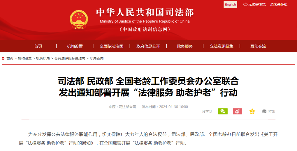 司法部、民政部、全國老齡辦日前聯(lián)合發(fā)出《關(guān)于開展“法律服務(wù) 助老護(hù)老”行動(dòng)的通知》,在全國部署開展“法律服務(wù) 助老護(hù)老”行動(dòng)。行動(dòng)聚焦老年人群體公共法律服務(wù)需求,推出6個(gè)方面措施。
