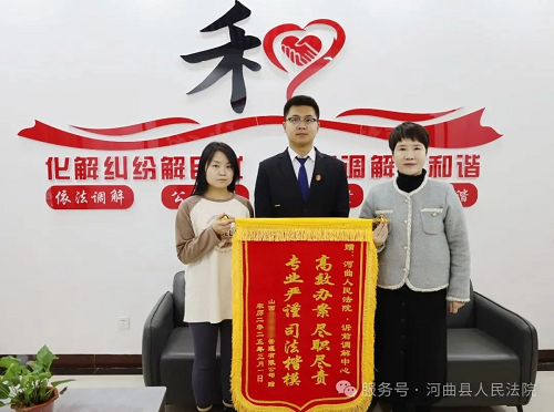 “感謝調(diào)解員為我們排憂解難,提供高效便捷的司法服務(wù),本來以為訴訟時間會很長,沒想到這么快就處理好了,今后我們一定努力提高服務(wù)水平?!苯?,某物業(yè)公司將一面寫有“高效辦案盡職盡責(zé) 專業(yè)嚴謹司法楷?!钡腻\旗送至河曲法院訴前調(diào)解中心,對法院溫馨的訴訟服務(wù)和特邀調(diào)解員優(yōu)質(zhì)高效的調(diào)解表示感謝!