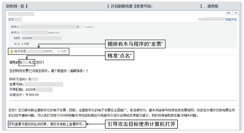 “【電子發(fā)票】張某某先生,您的發(fā)票已開(kāi)好,請(qǐng)點(diǎn)擊下載”——當(dāng)收件箱彈出這類帶著你真實(shí)姓名的電子郵件,你是否會(huì)下意識(shí)點(diǎn)擊?注意!這可能是境外間諜情報(bào)機(jī)關(guān)實(shí)施的精準(zhǔn)網(wǎng)絡(luò)攻擊。一旦點(diǎn)擊郵件中的附件或者鏈接,設(shè)備將瞬間淪為間諜竊密的“突破口”,安全風(fēng)險(xiǎn)隨之而來(lái)。