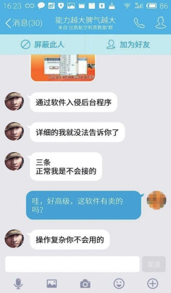 記者以求購機票信息為名在網(wǎng)上找到了十幾名以此為業(yè)的QQ用戶。其中,用戶名為“能力越大脾氣越大”的用戶告訴記者,每條航空機票信息售價18元,可以挑選特定的航空公司,買多了,價格還可以優(yōu)惠。他告訴記者,自己是通過軟件入侵后臺程序“調(diào)取”機票信息,而且都是客戶有需求的時候才去“調(diào)取”,保證信息新鮮有效。