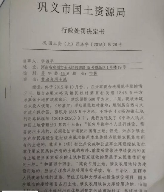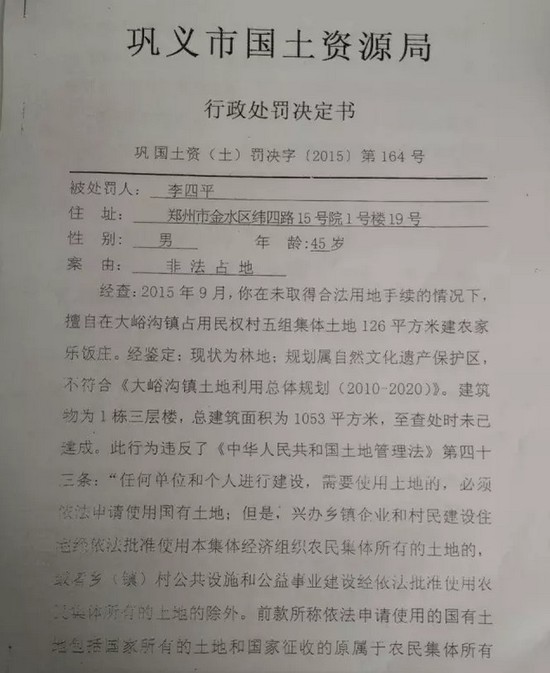 據(jù)記者獲取的材料顯示,2015年12月份,鞏義市國土資源局對李四平進(jìn)行處罰,案由為“非法占地”。李四平擅自占用集體土地126平方米,建設(shè)農(nóng)家樂,土地性質(zhì)為林地。對其處罰為“自行拆除在非法占用的126平方米土地上新建的建筑物和其他設(shè)施,恢復(fù)土地原狀”“對非法占用的126平方米土地,按每平方米3元處以罰款,共378元?!?/p>