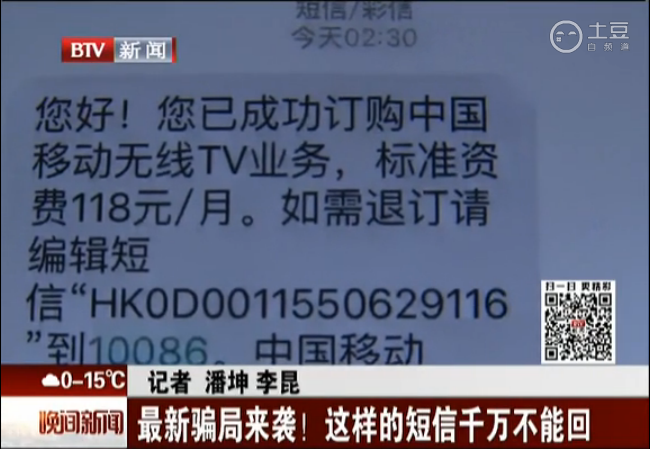 中國(guó)經(jīng)濟(jì)網(wǎng)北京11月4日訊 “您好!您已成功訂購(gòu)中國(guó)移動(dòng)無(wú)線TV業(yè)務(wù),標(biāo)準(zhǔn)資費(fèi)118元/月。如需退訂,請(qǐng)編輯短信HK***到10086。【中國(guó)移動(dòng)】”11月2日北京電視臺(tái)《晚間新聞》報(bào)道,近日,北京市民王小姐收到了“中國(guó)移動(dòng)”發(fā)來(lái)的這樣一條服務(wù)訂購(gòu)短信。