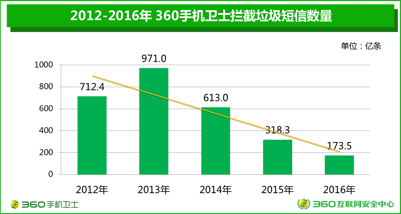 360手機(jī)衛(wèi)士日前發(fā)布的《2016年中國手機(jī)安全狀況報(bào)告》顯示,去年360手機(jī)衛(wèi)士共為全國用戶攔截各類垃圾短信約173.5億條,相較于2012年的700多億,降幅高達(dá)75.6%,五年來整體呈現(xiàn)快速下降的趨勢。