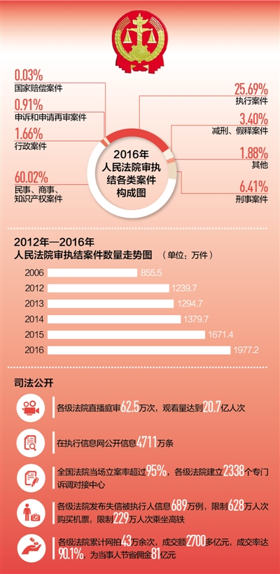 2016年,各級法院向執(zhí)行難全面宣戰(zhàn),共受理執(zhí)行案件614.9萬件,執(zhí)結(jié)507.9萬件,同比分別上升31.6%和33.1%,執(zhí)行到位金額1.5萬億元,同比上升54%。與公安部等10多個部門建立網(wǎng)絡(luò)執(zhí)行查控系統(tǒng),執(zhí)行法官足不出戶即可依法查詢被執(zhí)行人財產(chǎn)和相關(guān)信息,實現(xiàn)了執(zhí)行模式的根本變革。發(fā)布失信被執(zhí)行人信息689萬例,限制628萬人次購買機(jī)票,限制229萬人次乘坐高鐵。依法懲治拒不執(zhí)行裁判行為,司法拘留1.6萬人,追究刑事責(zé)任2167人,讓司法裁判真正成為懲治違法失信的利劍。