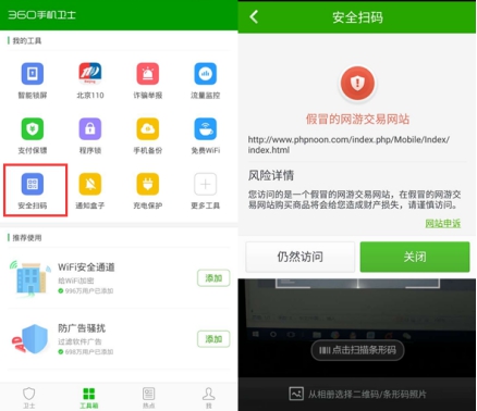 第五,使用360手機(jī)衛(wèi)士等安全管理軟件,通過(guò)安全掃碼功能掃描二維碼,識(shí)別釣魚網(wǎng)站以及手機(jī)木馬,保護(hù)手機(jī)安全不中招。