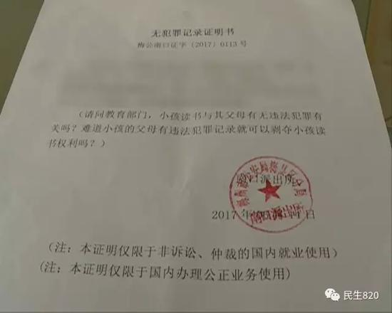 在派出所開具的證明書的中間打了括號,里面寫著:“請問教育部門,小孩讀書與其父母有無犯罪有關(guān)嗎?難道小孩的父母有違法犯罪記錄,就可以剝奪小孩讀書權(quán)利嗎?”