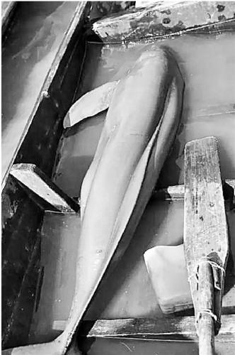 體重80多斤的大江豚在小木船中