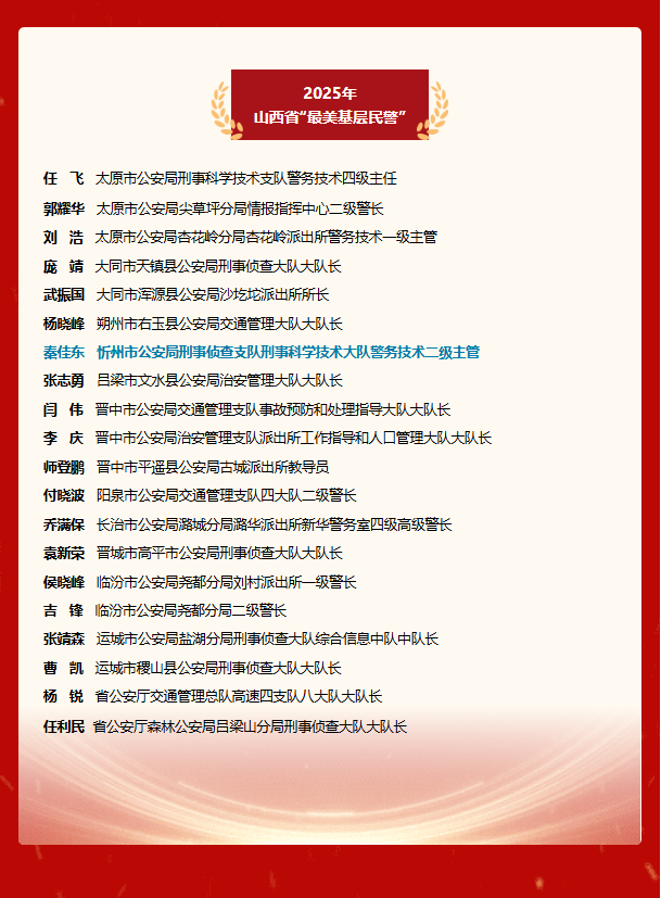 任飛、郭耀華、劉浩、龐靖、武振國、楊曉峰、秦佳東、張志勇、閆偉、李慶、師登鵬、付曉波、喬滿保、袁新榮、侯曉峰、吉鋒、張靖森、曹凱、楊銳、任利民20名同志光榮入選,其中,太原市公安局刑事科學(xué)技術(shù)支隊民警任飛還入選2025全國“最美基層民警”。