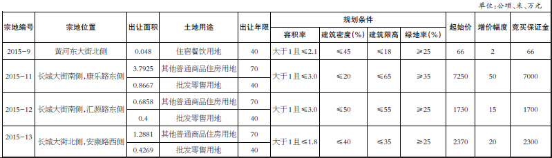 河國土告字[2016]1 號 經(jīng)河曲縣人民政府批準(河政土發(fā)[2015]13號、河政土發(fā)[2015]14號),河曲縣國土資源局決定以掛牌方式出讓4宗國有建設(shè)用地使用權(quán)?,F(xiàn)將有關(guān)事項公告如下: 一、掛牌出讓地塊的基本情況和規(guī)劃指標要求(見下表): 二、競買人范圍:境內(nèi)外自然人、法人和其他組織,除法律另有規(guī)定外均可競買。僅限單獨申請。 三、本次國有建設(shè)用地使用權(quán)掛牌出讓按照價高者得的原則確定競得人。 四、本次掛牌出讓的詳細資料和具體要求見掛牌出讓文件。申請人可于2016年1月11日至2016年2月22日到河曲縣政務(wù)大廳五樓公共資源交易中心獲取掛牌出讓文件。 五、申請人可于2016年1月11日至2016年2月22日到河曲縣政務(wù)大廳五樓公共資源交易中心向我局交易所提交書面申請。交納競買保證金的截止時間為2016年2月22日16:00。經(jīng)審核,申請人按規(guī)定交納競買保證金,具備申請條件的,將在2016年2月22日18:00前確認其競買資格。 六、本次國有建設(shè)用地使用權(quán)掛牌活動在河曲縣政務(wù)大廳五樓公共資源交易中心進行。以上4宗地的掛牌時間均為:2016年2月4日8:00至2016年2月24日9:00(節(jié)假日照常休息)。 七、按照城建規(guī)劃條件競買2015-11號、2015-12號、2015-13號宗地時要配建占住宅總建筑面積≥5%的公共租賃住房(套型建筑面積≤60平方米),建成后由政府按合同約定收回。競買報名者在報名時要到住建部門咨詢辦理有關(guān)配建公共租賃住房相關(guān)事宜,否則后果自負。 八、其他需要公告的事項: (一)掛牌時間截止時,有競買人表示愿意繼續(xù)競價,轉(zhuǎn)入現(xiàn)場競價,通過現(xiàn)場競價確定競得人。 (二)掛牌成交后,競得人應(yīng)在《掛牌成交確認書》規(guī)定的期限內(nèi)簽訂出讓合同,并按出讓合同約定時限繳清全部土地出讓價款。 (三)起始價、成交價僅為地價,不含其他稅費。 (四)報名時需攜帶河曲縣人民檢察院出具的《查詢行賄犯罪檔案結(jié)果告知函》。 (五)申請人報名交納保證金截止時是2016年2月22日16:00,以交入河曲縣文筆信用社縣國土資源交易所賬戶的競買保證金到賬時間為準。 (六)本次掛牌設(shè)有掛牌底價。 (七)本次出讓不接受郵寄、電子郵件、電話或口頭競買申請。 九、聯(lián)系方式: 聯(lián)系地址:河曲縣政務(wù)大廳五樓公共資源交易中心 聯(lián)系人:丁先生13327507373王女士13994066613 開戶單位:河曲縣國土資源交易所 開戶銀行:河曲縣文筆信用社 銀行賬戶:31203120111185 河曲縣國土資源局 2016年1月10日