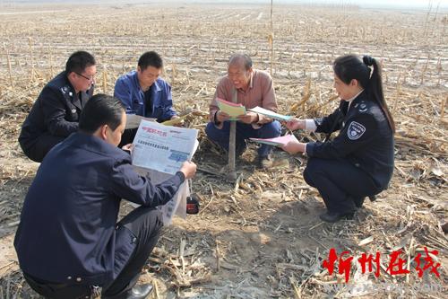 怎樣把《中華人民共和國大氣污染防治法》和《五臺縣人民政府嚴(yán)防森林火災(zāi)的通告》宣傳到人?五臺縣環(huán)境保護局、環(huán)境監(jiān)察大隊分組劃片,組織環(huán)保人員深入到田間地頭,面對面讀報給農(nóng)民聽,手遞手散傳單讓農(nóng)民看,為農(nóng)民解釋燒秸稈、燒地堰、燒荒等野外違規(guī)用火行為的危害。臺城鎮(zhèn)西關(guān)村66歲的農(nóng)民張存在就高興地對縣環(huán)境監(jiān)察人員說:“你們這樣解釋,咱懂,“地頭環(huán)?!痹坜r(nóng)民也記得牢,我家4畝地的秸稈保證不燒一根,咱漚糞去,多打糧,又不污染?!眻D為地頭宣傳環(huán)境保護,增強農(nóng)民環(huán)保意識。(金俊賢 攝)