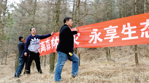 清明節(jié)來臨之際,靜樂公路管理段駐赤泥窊鄉(xiāng)范家洼村扶貧工作隊深入開展護(hù)林防火宣傳。圖為工作隊員深入林區(qū)懸掛護(hù)林防火標(biāo)語。(李永珍 攝)