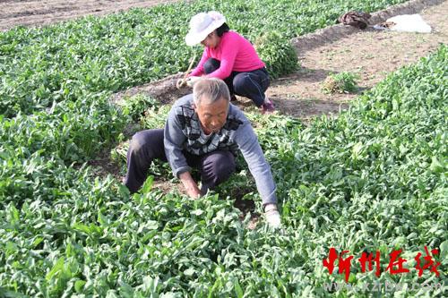 4月7日,原平市南灘村綠油油的菜地里,一對夫妻正在揮鐮收菠菜,準(zhǔn)備銷往市場。該市在落實(shí)各項(xiàng)惠農(nóng)政策的同時(shí),積極推進(jìn)農(nóng)業(yè)結(jié)構(gòu)調(diào)整,將簡單粗放型農(nóng)業(yè)向精細(xì)高效型農(nóng)業(yè)提升,使農(nóng)民收入成倍翻番,真正讓農(nóng)民嘗到了甜口。(褚震 攝)