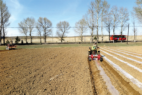 時(shí)下正值春耕春播時(shí)節(jié),我市各地的農(nóng)民忙著翻地、撒肥、鋪膜、犁土、播種,田野上拖拉機(jī)、播種機(jī)等農(nóng)機(jī)來(lái)回穿梭,一片繁忙景象。圖為4月21日五寨縣小河頭村村民正在鋪膜。(張志遠(yuǎn) 攝)