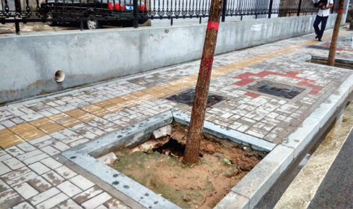 8月14日,記者在城區(qū)建設南路與長征西街交匯處往南不遠處發(fā)現(xiàn),人行道一棵樹栽種區(qū)內(nèi)有一個破洞,并且有往左側(cè)延伸的趨勢,在雨水的沖擊下可能會對樹木和周圍道路造成影響,希望相關部門能夠重視,做到防患于未然。(許凈 攝)