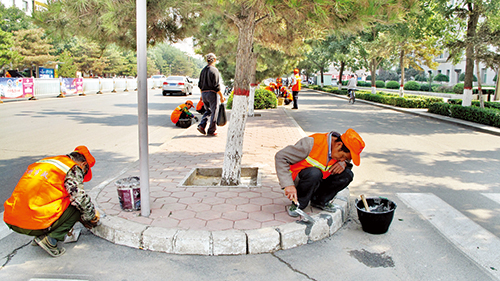 9月15日,正值中秋佳節(jié),市政工程公司員工放棄休息,在長征街修補(bǔ)路牙石,為我市城區(qū)創(chuàng)建國家衛(wèi)生城市盡自己的職責(zé)。(郭健 攝)