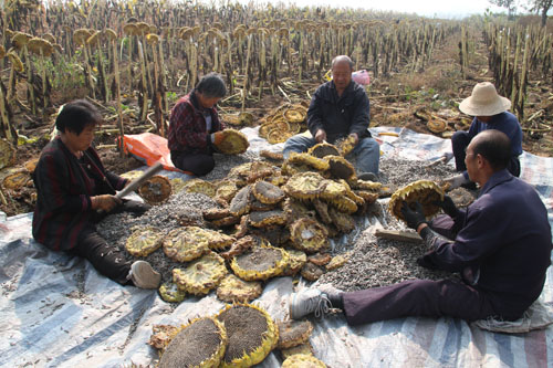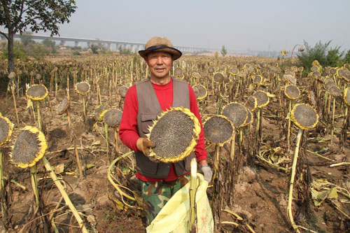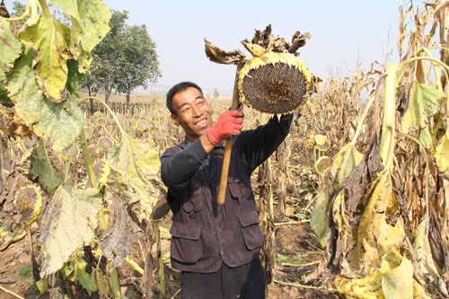 10月13日,原平市解村鄉(xiāng)圪坨村林同種植專業(yè)合作社正在收獲向日葵,該社引進三瑞公司種植1000余畝SH363向日葵喜獲豐收。近年來,該市積極引導(dǎo)農(nóng)民調(diào)整農(nóng)業(yè)產(chǎn)業(yè)結(jié)構(gòu),采取“合作社+農(nóng)戶”的模式,向日葵比玉米收入高四倍,銷售價每斤4塊左右,合作社為農(nóng)戶提供種子、種植技術(shù)等服務(wù),帶動當(dāng)?shù)厝罕娫鍪罩赂弧?span style="font-family: 楷體,楷體_gb2312, simkai">圖為解村鄉(xiāng)村民趁著秋高氣爽的晴好天氣,在田間地頭葵花籽的情景。(褚震 攝)