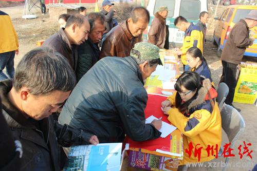 11月29日,原平市聚農(nóng)豐肥料合作社在農(nóng)貿(mào)市場(chǎng)擺攤推銷(xiāo)肥料。入冬以來(lái),該合作社充分利用鄉(xiāng)下農(nóng)貿(mào)市場(chǎng)趕集的機(jī)會(huì),帶著各種肥料的宣傳資料,現(xiàn)場(chǎng)與農(nóng)民對(duì)接簽訂免費(fèi)送肥合同,受到農(nóng)民歡迎。(曹申義 攝)