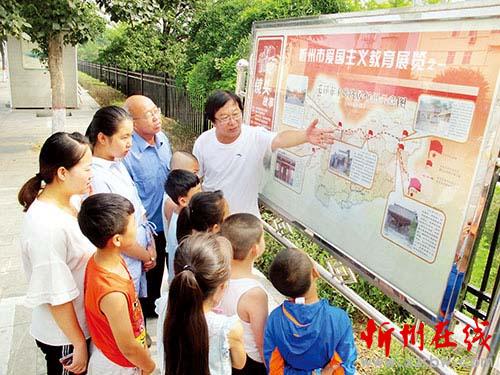 檔案人董建平(中)向青少年義務宣講愛國主義教育展覽。