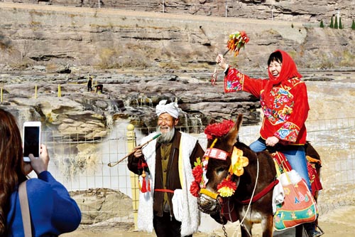 3月22日,游客在黃河壺口瀑布拍照留念。