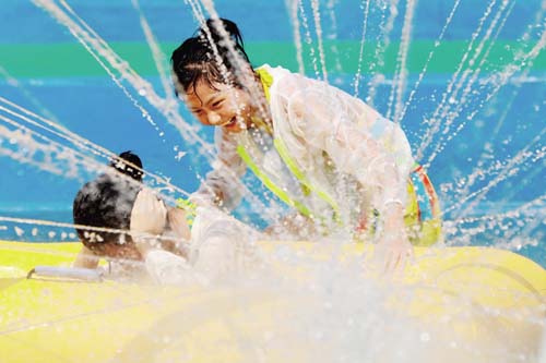7月16日,孩子們在江蘇省淮安市盱眙縣玉皇山水上樂園戲水消暑。新華社 周海軍 攝