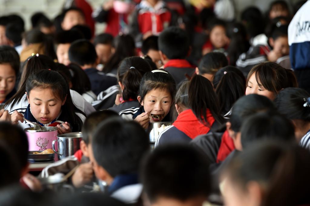 ↑這是學(xué)生們在食堂吃午餐(4月16日攝)。新華社記者詹彥攝