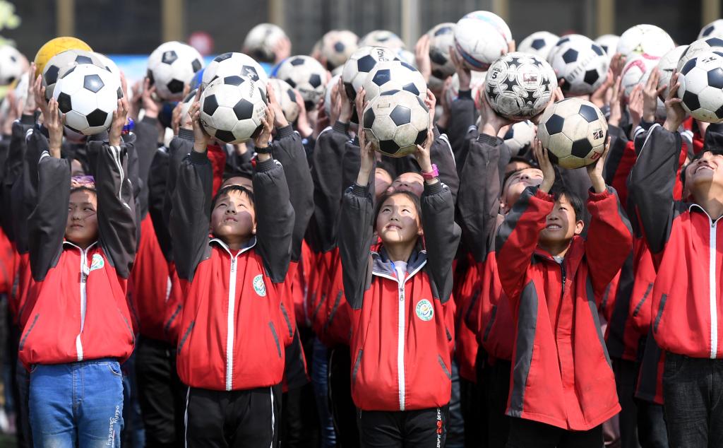 ↑這是學(xué)生們準(zhǔn)備做足球操(4月18日攝)。新華社記者李俊東攝