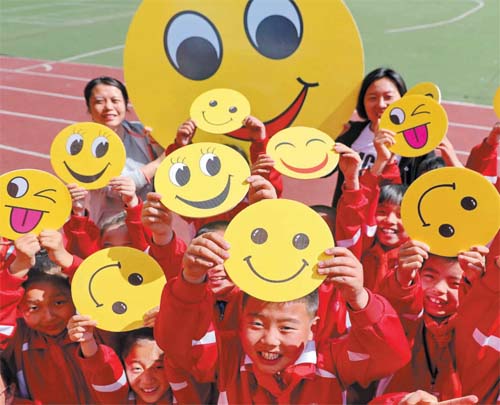 5月7日,各地學(xué)校舉辦豐富多彩的“微笑”主題活動(dòng),迎接5月8日世界微笑日的到來。圖為河北省秦皇島市河?xùn)|小學(xué)的學(xué)生在展示笑臉卡。