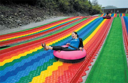 湖北省恩施土家族苗族自治州宣恩縣沙道溝鎮(zhèn)二臺坪村是個(gè)三面臨崖的高山鄉(xiāng)村,在實(shí)施精準(zhǔn)扶貧過程中,于2018年修通了進(jìn)村水泥路。隨著交通條件的改善,當(dāng)?shù)卮迕衤?lián)合成立旅游經(jīng)營公司,推進(jìn)以綠色生態(tài)為底色的“多彩鄉(xiāng)村游”,讓昔日沉寂的鄉(xiāng)村變得多姿多彩。圖為5月13日,游客在湖北省宣恩縣二臺坪村的游樂場體驗(yàn)滑草樂趣。