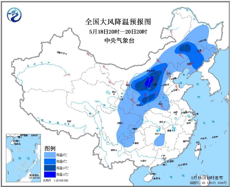 預(yù)計(jì),5月18日20時(shí)至20日20時(shí),西北地區(qū)大部、華北大部、東北地區(qū)、黃淮、新疆等地的部分地區(qū)有5~7級(jí)風(fēng),陣風(fēng)可達(dá)8~9級(jí),其中,內(nèi)蒙古中部和東部、山西北部、河北北部等地局地陣風(fēng)可達(dá)10級(jí)以上;東北地區(qū)大部、華北中東部、黃淮西部、西北地區(qū)東部、西南地區(qū)東部等地最低溫度或平均溫度將下降6~8℃,其中,內(nèi)蒙古中部偏南地區(qū)、陜西北部、山西北部、吉林西部等地的部分地區(qū)降溫10℃以上。中央氣象臺(tái)5月18日18時(shí)繼續(xù)發(fā)布大風(fēng)降溫預(yù)報(bào)。