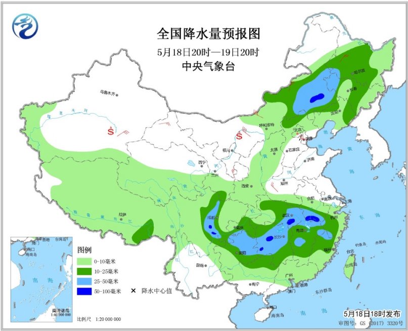 5月18日20時(shí)至19日20時(shí),內(nèi)蒙古中東部、東北地區(qū)中部、四川盆地西部、西南地區(qū)東部、江漢、江南等地的部分地區(qū)有中到大雨,其中內(nèi)蒙古東南部、四川盆地西南部、湖南北部、湖北南部、安徽南部等地局地有暴雨(50~80毫米),上述部分地區(qū)有短時(shí)強(qiáng)降水,局部并伴有雷暴大風(fēng)等強(qiáng)對(duì)流天氣。西北地區(qū)中東部、內(nèi)蒙古大部、華北、東北等地的部分地區(qū)有5~7級(jí)風(fēng),局地陣風(fēng)8~9級(jí)。內(nèi)蒙古西部、南疆盆地等地有揚(yáng)沙或浮塵天氣。