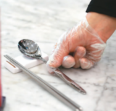 在北京市朝陽大悅城一家餐飲店內(nèi),食客隔位而坐,餐具“公私”分明?!伴_始使用公筷、公勺時,有點不習慣,不過現(xiàn)在已經(jīng)適應了,分著吃更安全。”在店內(nèi)用餐的黃先生說。