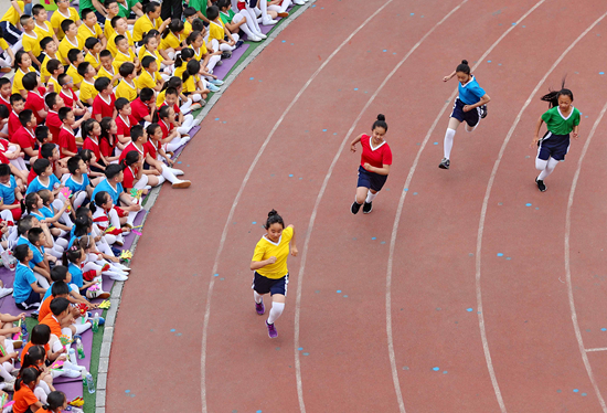 2019年6月6日,河北秦皇島,海港區(qū)新一路小學學生在全國學校體育聯(lián)盟(教學改革)海港區(qū)實驗校階段性成果展示活動中表演趣味比賽項目。視覺中國供圖