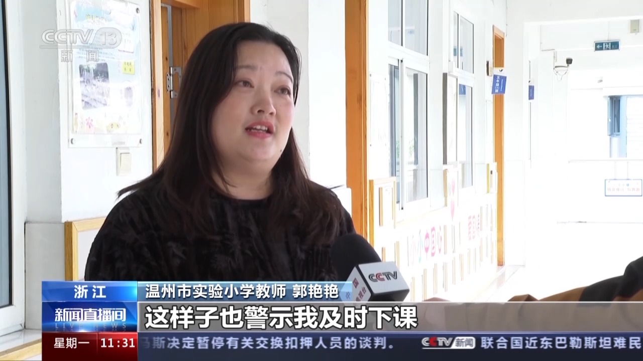 溫州市實驗小學教師 郭艷艷:這個鈴聲是挺大的,我要是繼續(xù)上課的話,孩子們也不能夠很清楚地聽到我的聲音,這樣也警示我及時下課。