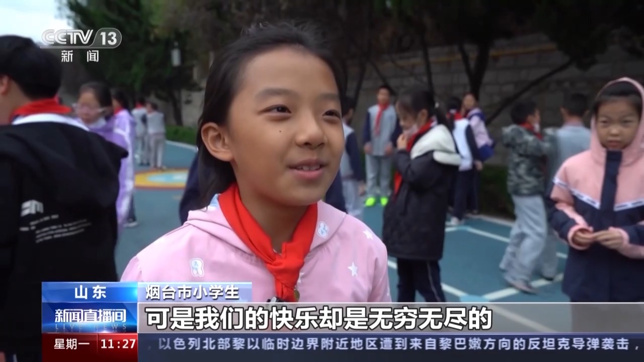 江蘇如皋市小學生 朱卉鈺:我感覺一下課出來玩,可以在外面玩玩游戲,在外面跑一跑就特別舒服。我希望下課的時間再長一點,可以再玩一些游戲。