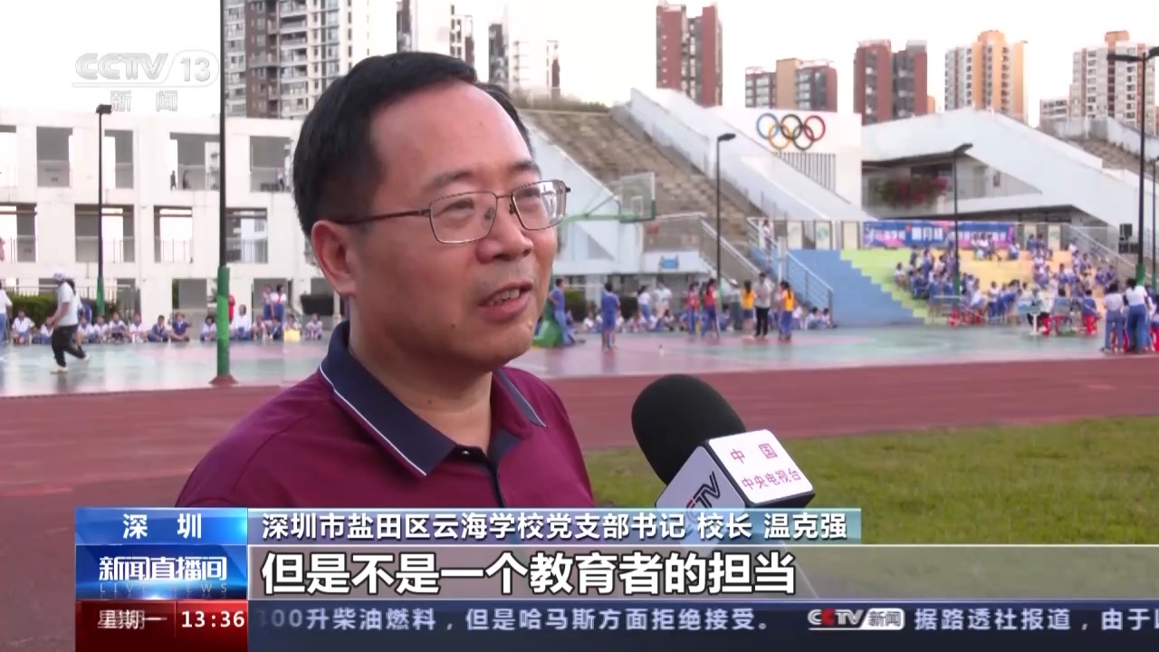 深圳市鹽田區(qū)云海學校黨支部書記、校長 溫克強:怕出事情,怕?lián)熑?,就把學生課間圈養(yǎng),確實這個是省時省力,但是不是一個教育者的擔當,也不是一個學校的擔當。應該尊重教育規(guī)律,要為孩子們的健康著想。希望我們的孩子在這邊讀9年,他會科學地鍛煉,有這種鍛煉的好習慣,熱愛體育,熱愛生活,這就是我們追求的方向和育人目標。