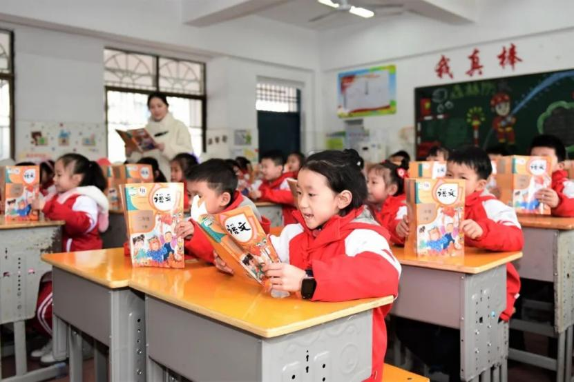 2023年2月7日,湖南省郴州市第十二完全小學,老師領讀新學期第一課。通訊員 曹高林 攝