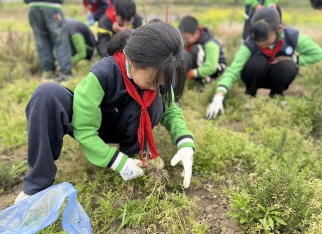 4月16日,南京市力行小學的同學們在藥植園里除草勞動。(力行小學供圖)
