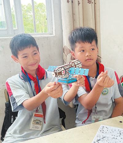 “這是航天衛(wèi)星的兩翼,是安裝太陽能電池板的地方?!眮碜詮V西壯族自治區(qū)梧州市藤縣第五小學的三年級學生李杰峰驕傲地展示著親手組裝的模型,他希望將來能從事航天工作。
