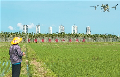 7月6日,海南省瓊海市嘉積鎮(zhèn)農(nóng)民在利用無人機噴灑農(nóng)藥。蒙鐘德攝(人民視覺)