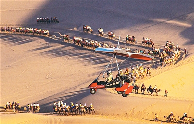 近年來,在甘肅省敦煌市鳴沙山月牙泉景區(qū)運營的敦煌“飛天”通用航空項目,為游客提供低空飛行器旅游服務(wù),讓游客乘坐直升機、動力滑翔機,從空中欣賞大漠綠洲和月牙泉美景,沉浸式體驗敦煌獨特魅力。圖為7月3日,游客乘坐滑翔機空中俯瞰敦煌大漠風(fēng)光。王斌銀攝(人民視覺)