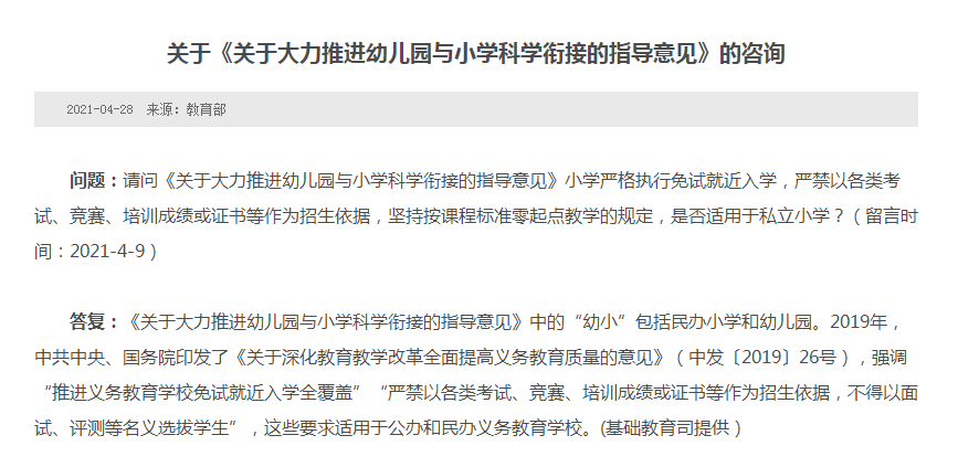 新華網(wǎng)北京4月28日電 近日,教育部在回應(yīng)網(wǎng)友咨詢《關(guān)于大力推進(jìn)幼兒園與小學(xué)科學(xué)銜接的指導(dǎo)意見》相關(guān)問題時(shí)表示,該指導(dǎo)意見中的“幼小”包括民辦小學(xué)和幼兒園。2019年,中共中央、國(guó)務(wù)院印發(fā)了《關(guān)于深化教育教學(xué)改革全面提高義務(wù)教育質(zhì)量的意見》(中發(fā)〔2019〕26號(hào)),強(qiáng)調(diào)“推進(jìn)義務(wù)教育學(xué)校免試就近入學(xué)全覆蓋”“嚴(yán)禁以各類考試、競(jìng)賽、培訓(xùn)成績(jī)或證書等作為招生依據(jù),不得以面試、評(píng)測(cè)等名義選拔學(xué)生”,這些要求適用于公辦和民辦義務(wù)教育學(xué)校。