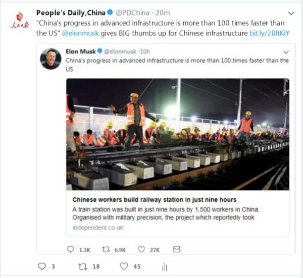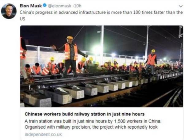 央廣網(wǎng)北京2月28日消息 近年來,中國速度日益引發(fā)外媒關注。今天(28日),一段中國工人在火車站施工的視頻又走紅美國,剛剛將跑車送上太空的企業(yè)家馬斯克(Elon Musk)也忍不住轉發(fā)贊嘆,“中國先進基礎設施發(fā)展速度比美國快了100多倍”。